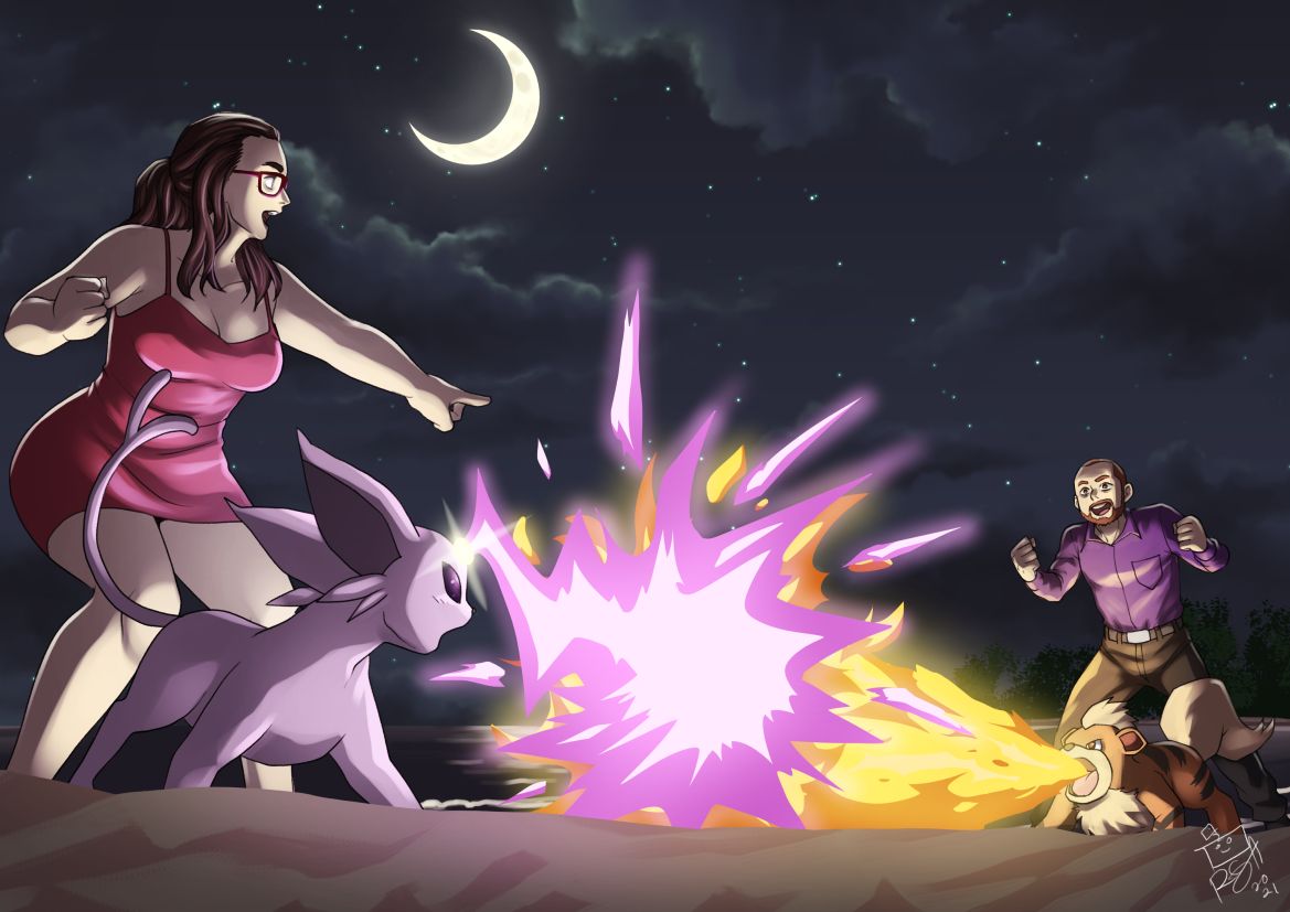 Up to 4 Trainers • Up to 6 Pokémon • Cinematic battle background • Dramatic lighting effects • 7–10 day delivery • 2 revisions